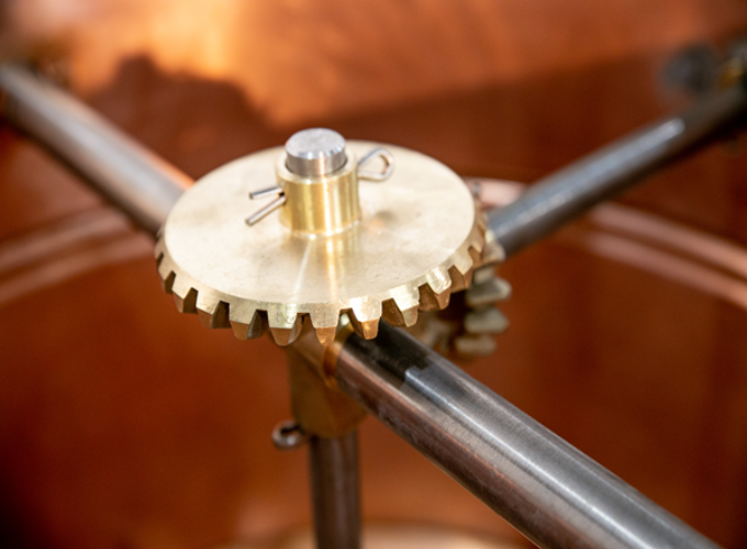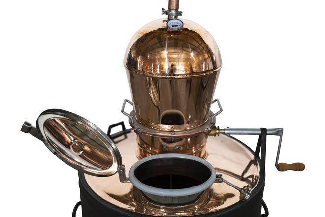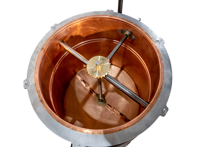 El sellado de silicona destinado para sellar alambiques y tapas, cumple con los requisitos de la Ley de Seguridad Alimentaria de la Industria Alimentaria General, satisface los requisitos en términos de seguridad alimentaria y regularidad. Todas las partes del dispositivo que entran en contacto con la masa de frutas fermentadas, el vapor o el destilado en sí mismo, están hechas de cobre electrolítico de la más alta calidad. Una manivela conectada al eje transfiere la rotación mediante engranajes. Un mezclador está conectado al eje. El mezclador evita que la masa se queme durante el proceso de destilación con un manejo simple y fácil. El cobre es uno de los mejores conductores de calor, resistente a los ácidos orgánicos y tiene un efecto muy bueno en el sabor y el olor del destilado, demostrado mejor que cualquier otro metal.