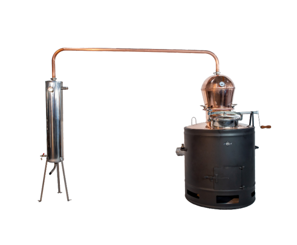 Los modelos estables de alambiques son dispositivos para la destilación de bebidas alcohólicas de frutas de alta capacidad destinados para uso industrial individual. El conjunto de calderas para la destilación de bebidas alcohólicas consta de una olla de cobre con un mezclador manual mecánico incorporado en un horno, fabricado en chapa de metal laminado en frío. Se instalan puertas de acceso de acero inoxidable AISI 304 (300×200 mm) para verter la masa. Se instala una válvula de bola de latón de 3″ para vaciar el dispositivo. La caldera y la tapa están conectadas por una brida de acero inoxidable de 4 mm de espesor y un sellado de silicona de 5 mm de espesor.