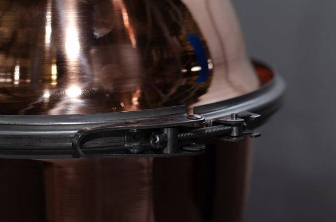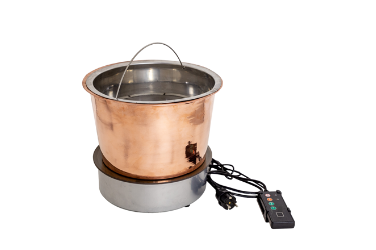 Este pequeño equipo multipropósito está diseñado para la producción de todo tipo de bebidas y aceites esenciales. Es un equipo completo que incluye su propia fuente de calor eléctrica de 2 kW, una olla y tapa de cobre unidas mediante una abrazadera de conexión rápida (clamp).